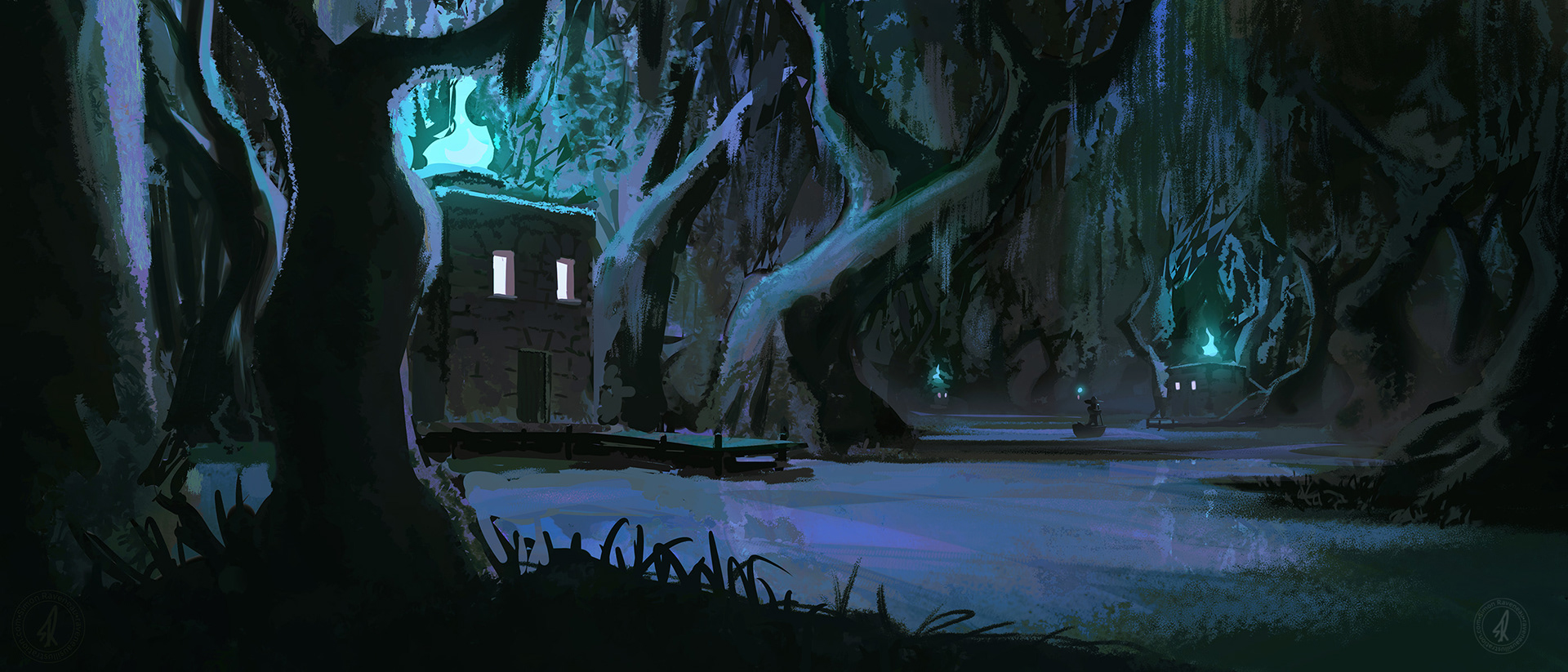 Concepte d'un réseau de phare pour naviger à travers les marais. Color keys réalisées pour le challenge 19 du site DigitalPainting.chool sur le thème ombre et lumière.